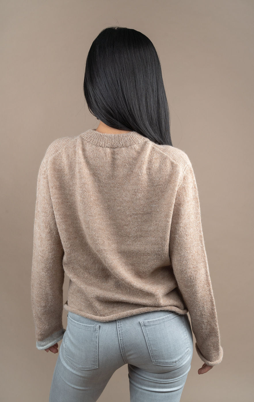 Amalia is a fine and cosy crew neck  sweater in 100% baby alpaca. It has a hip length and  rolled edges at the hem and cuffs. Little detail : the left cuff is in a matching color.