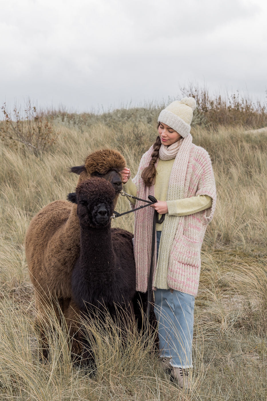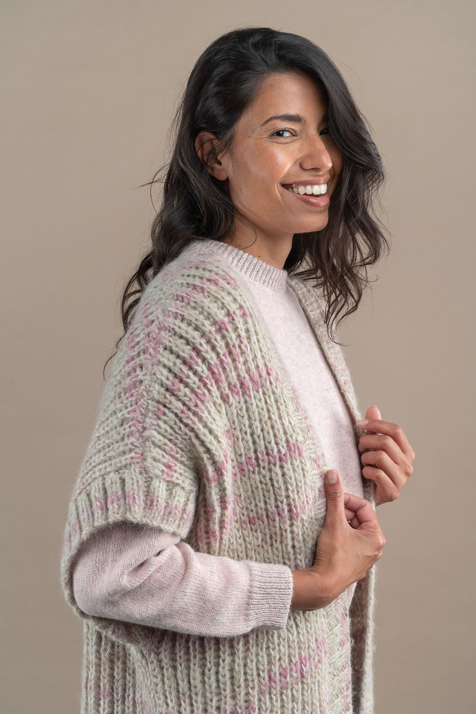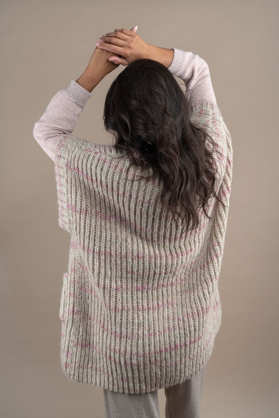 With this elegant, sleeveless 100% baby alpaca cardigan, you will look forward to colder days. It feels warm and cosy, yet light and stylish. Handknitted. Model is 178 cm. One size.
